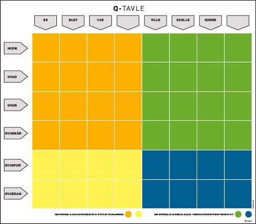 Q-tavlen støtter lærere og elever i at nå længere ind i et emne ved hjælp af spørgsmål, som går længere end til den faktuelle overfladelæring. Den støtter også den dybdegående, sammenkædende, forklarende, analyserende og perspektiverende læring.