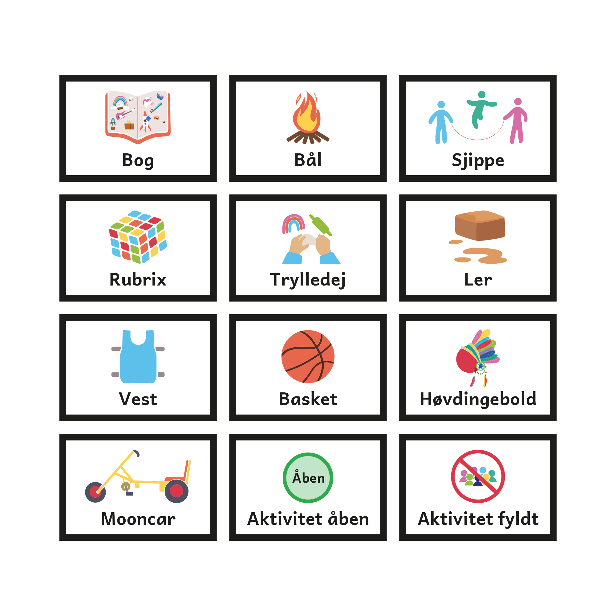✔ 59 piktogrammer til frikvarteret (125 x 85 mm) – Dækker en bred vifte af aktiviteter, fx boldspil, sjippetov, Mooncar og kreative lege.