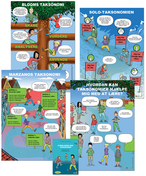 Hæftet Dybdelæring med taksonomier - differentiering og tydelig progression fungerer som en vejledning i og inspiration til arbejdet med taksonomiplakaterne Blooms taksonomi, SOLO-taksonomien, Marzanos taksonomi og Hvordan kan taksonomier hjælpe mig med at lære?